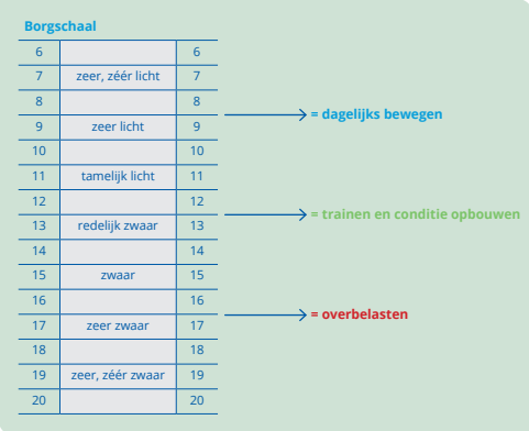 De Borgschaal geeft inzicht in verantwoord bewegen en trainen. Hiermee kunt u de zwaarte of intensiviteit van een activiteit een cijfer geven. Dit cijfer is persoonlijk: Alleen u weet hoe zwaar een activiteit voor u aanvoelt. Hoe meer conditie en spierkracht u opbouwt, hoe minder moeite activiteiten u zullen kosten. Een activiteit die u in het begin redelijk zwaar (13) vindt, zal na een tijdje oefenen tamelijk licht (11) gaan voelen.