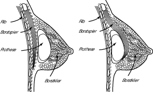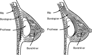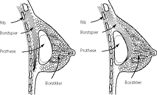 De borstvergroting vindt plaats door een borstprothese, gevuld met siliconen of met water, in te brengen. De prothese kan worden geplaatst tussen de borstklier en de grote borstspier, of tussen de grote borstspier en de ribbenkast (zie tekeningen). Het litteken komt te liggen in de plooi onder de borst.