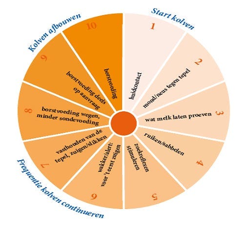 De baby moet langere tijd wakker zijn, zich soms melden, zuigbehoefte hebben en zijn voedingen verdragen. Als de baby in staat is aan de borst te drinken wordt hij voor en na de voeding gewogen.