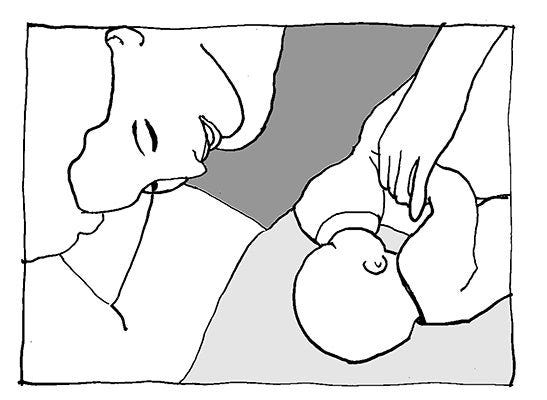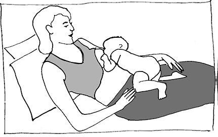 Als eerste kolft moeder haar borst helemaal soepel. Vervolgens komt de baby in kangoeroe houding bij haar liggen en vanuit die kan de baby naar de borst afzakken. Op deze manier kan de baby oefenen met likken, sabbelen, zoekbewegingen maken, mondje openen.