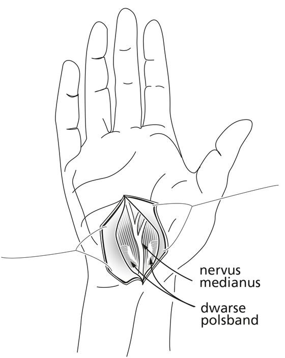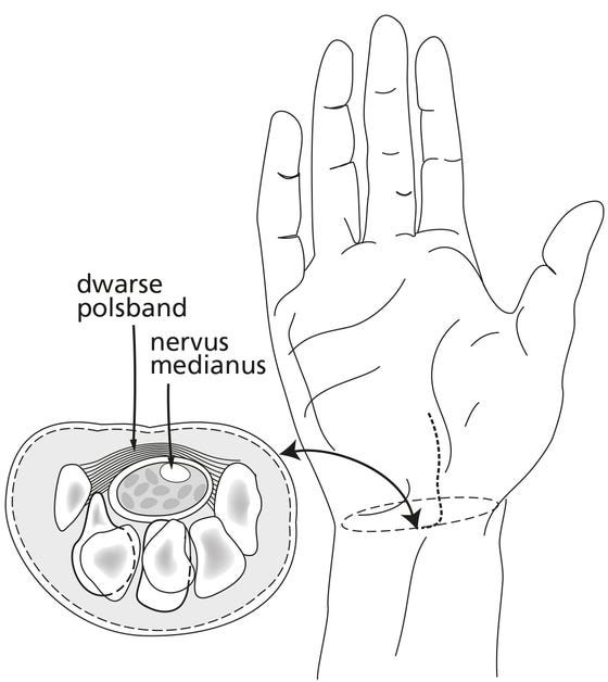 Een operatie is niet altijd noodzakelijk. Soms is een verandering van werkzaamheden voldoende om de klachten te doen verdwijnen. Het dragen van een nachtspalk kan de klachten verlichten. Ontstekingsremmende medicijnen die geslikt worden of geïnjecteerd worden in de carpale tunnel, kunnen bijdragen aan het verminderen van de zwelling in de carpale tunnel. Als de symptomen ernstig zijn of niet verbeteren, kan een operatie nodig zijn om de ruimte binnen de carpale tunnel te vergroten. Dit gebeurt door het dak van de tunnel, dat gevormd wordt door een stevige band, door te snijden (zie afbeelding). Hierdoor wordt de tunnel vergroot en de druk op de zenuwen verminderd. Na de operatie kan de pijn rond het litteken een aantal weken of maanden voortduren. De gevoelloosheid en tintelingen kunnen zowel direct na de ingreep als na verloop van tijd verdwijnen. Het kan enige maanden duren voordat de kracht in de hand en de pols weer normaal is. De symptomen van het Carpale Tunnel Syndroom verdwijnen helaas niet altijd volledig door de operatie.