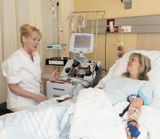 Of course, a family member or relative may also be present during the procedure. After the harvesting procedure, a blood sample is taken to check your blood count. The infusion lines are disconnected and one needle is removed. The harvested stem cells are counted in the stem cell laboratory. If there are sufficient stem cells and your blood count is in order, the second needle is removed and you can go home. We advise you not to drive home yourself.