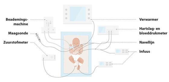 Uw kind wordt naar de afdeling gereden. Ook nu kan een partner of naaste meelopen als u dat prettig vindt. Voordat u de afdeling binnen gaat, moet u uw handen schoonmaken met alcohol. Ook wordt u gevraagd uw horloge, armbanden en ringen af te doen. Dit doen we om de kleine en kwetsbare kinderen op onze afdeling te beschermen tegen infecties. Zodra uw kind op de afdeling is, zal het gewogen worden en krijgt het een luier om. Ook zullen we hem of haar aansluiten aan meerdere apparaten, o.a. om de hartslag en ademhaling goed in de gaten te kunnen houden.