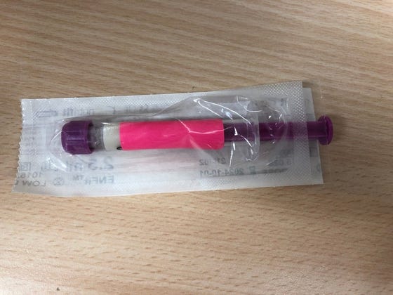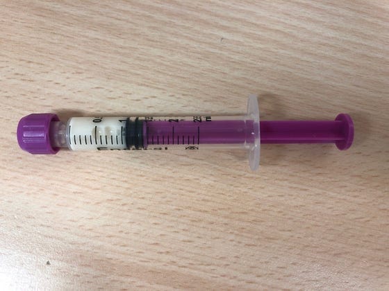 Wij willen u vragen deze 4,5 ml thuis te verdelen over 3 paarse spuitjes.