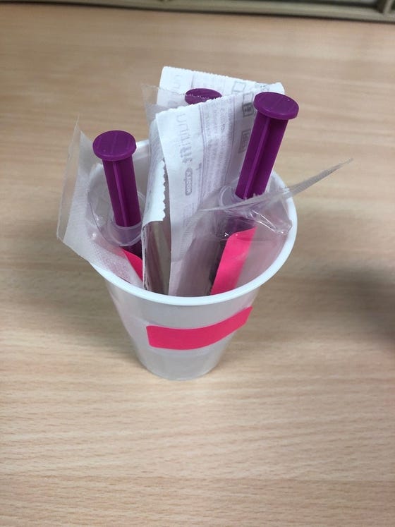 Spuitjes en dopjes kunt u vinden in de kast op de gang waar de kolfflesjes staan.. Witte bekertjes liggen in de onderste lade bij uw kind.