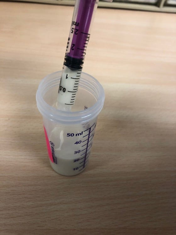 Voor mondverzorging is 4,5 ml moedermelk per dag nodig. We starten pas met deze mondverzorging als er voldoende moedermelk is voor zowel voeding als mondverzorging. Afgekolfde moedermelk wordt eerst gebruikt om te voeden. Als er onvoldoende moedermelk is, gebruiken we water voor de mondverzorging.