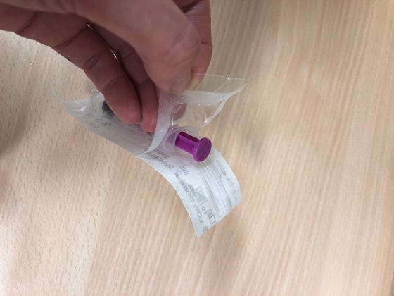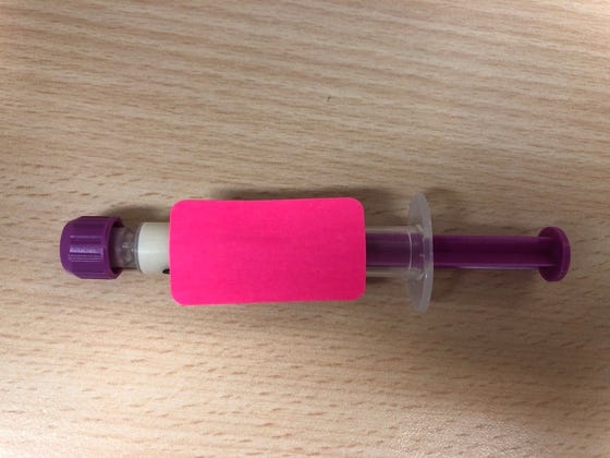 Verdeel de 4,5 ml over 3 paarse spuitjes, 1,5 ml per spuitje. Sluit het spuitje af met een dopje.