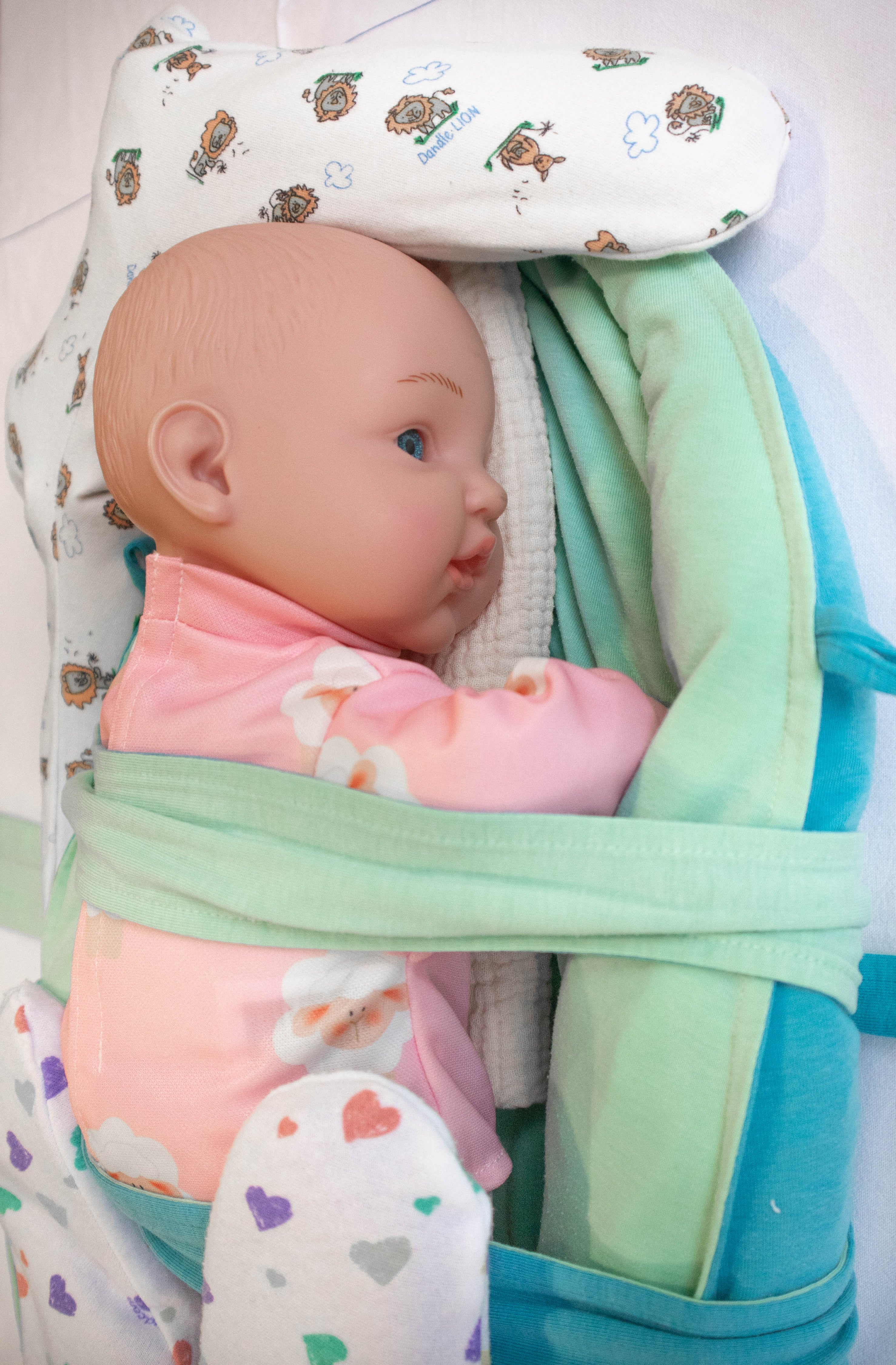 Mocht er niemand kunnen ondersteunen dan kunt u het bovenlichaam van uw kind met de armen in een hydrofiele luier wikkelen en/of gebruik maken van een verzwaard kussentje (frog), waarbij uw kind de handen bij de mond heeft en de armen gebogen zijn.