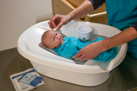 Baad uw kind ingewikkeld in een hydrofiele luier. Tijdens het baden wast u steeds een deel van het lichaam. Wanneer uw kind tekenen van ongemak (zie verzorging) laat zien, dan slaat u de doek weer terug. Bij geen tekenen van ongemak laat u de doek steeds verder open.