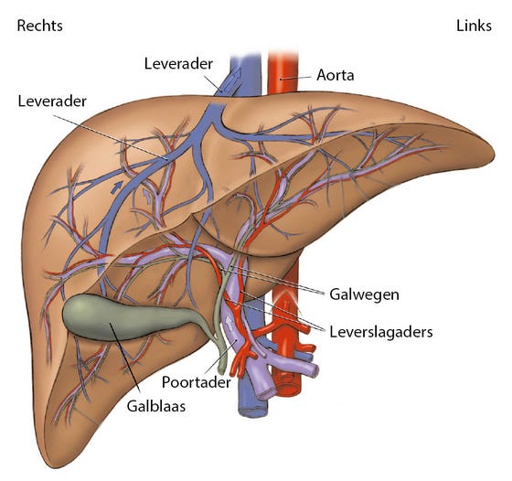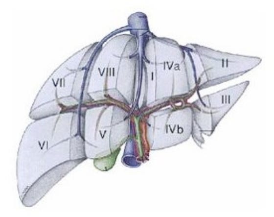 Zie de afbeelding hierboven: Lever verdeeld in segmenten.