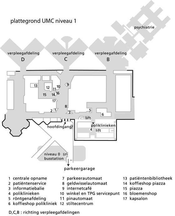 Hieronder vindt u een plattegrond van het AZU. Voor meer informatie kunt u ook terecht bij de receptie bij de hoofdingang.