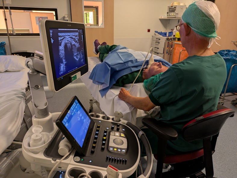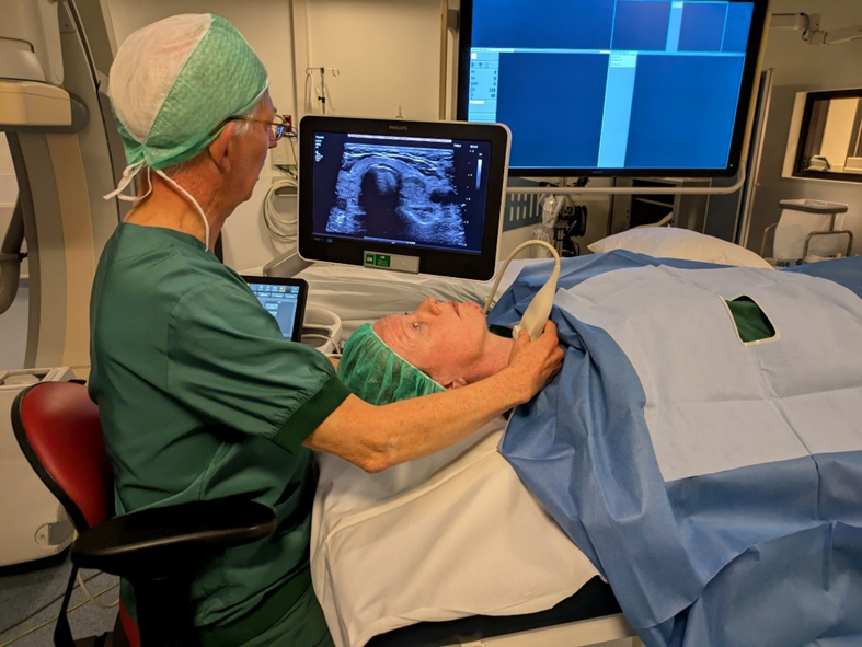Voor de behandeling komt u op een onderzoekstafel te liggen met het hoofd iets achterover. De radioloog die de behandeling uitvoert zit achter u (zie afbeelding hieronder). Op elk been wordt een aardingspad (een soort grote plakker) aangebracht. Met echografie zal de radioloog de exacte plaats en het volume van de schildkliernodus  bepalen.