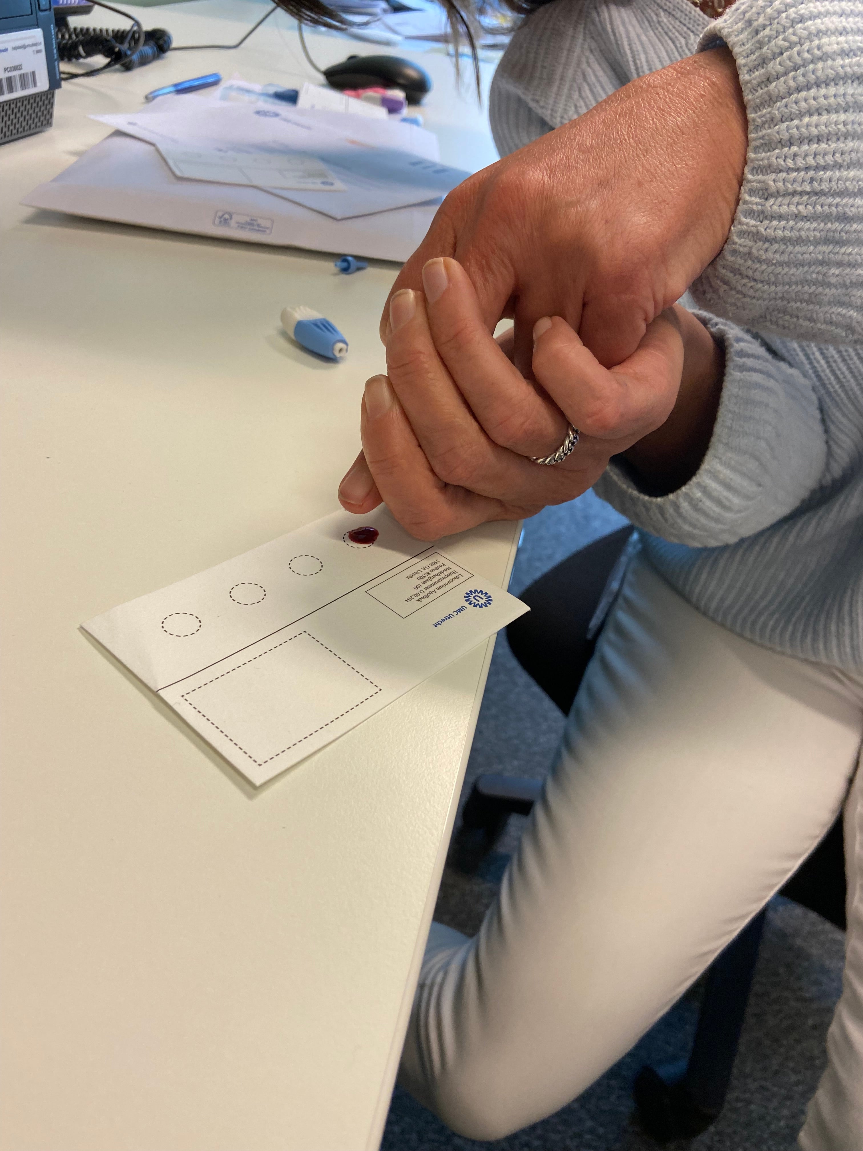 Houd de vingertop boven de voorgedrukte cirkel op het bloedspotkaartje. Laat een grote druppel bloed in het midden van de cirkel vallen, deze vloeit vanzelf uit. (Veeg of druk het bloed niet met de vinger op het bloedspotkaartje, want dan is de meting niet betrouwbaar!)