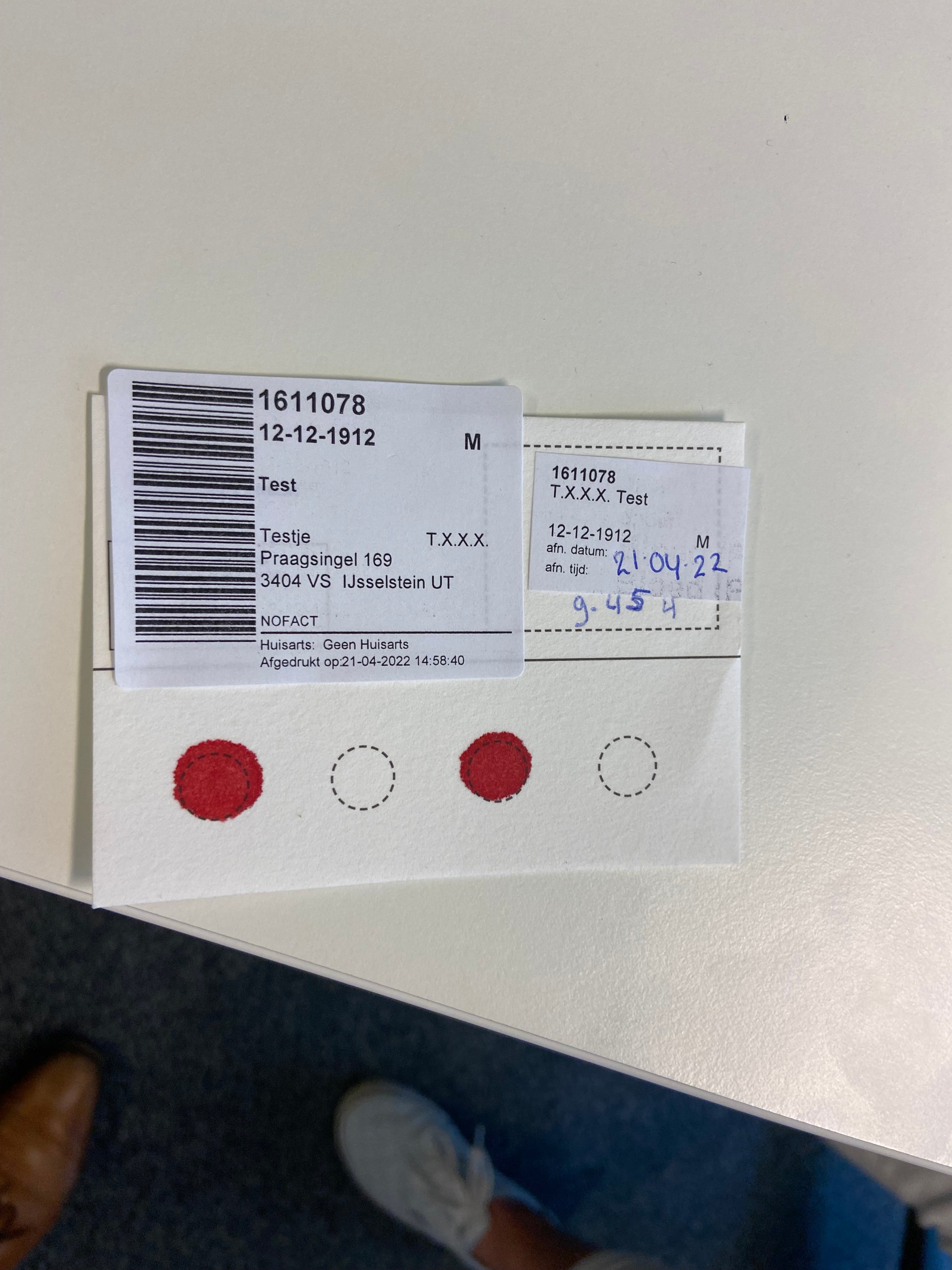 - Stickervel met uw patiënt gegevens (naam, geboortedatum, ziekenhuisnummer)