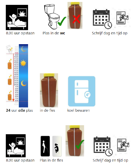 NB. U kunt op elk willekeurig ander moment beginnen met het verzamelen van urine, als het maar een aaneengesloten periode van 24 uur is. Als er andere verzameltijden gevraagd worden, volgt u de verstrekte instructies nauwkeurig op.