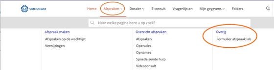 Wilt u als ouder inloggen? Dan moet u eerst gemachtigd zijn. Daarvoor vult u op deze pagina een machtigingsformulier in. U logt vervolgens met uw eigen DigiD met sms-functie of via de DigiD-app in. - Klik in de navigatiebalk op Afspraken. Klik daarna op Overig. Uw Formulier afspraak lab staat daar voor u klaar.