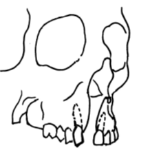 Bij de dubbelzijdige schisis is er sprake van drie kaakdelen (zie figuur 2). Het middelste kleine deel – de “tussenkaak” genoemd – is met een dunne botspaan verbonden aan het neustussenschot. Het staat soms in een verkeerde stand. Dan moet dit kaakdeel worden losgemaakt. Dit wordt een “osteotomie” genoemd: “os” betekent bot en “tomie” wil zeggen doorsnijden/zagen. Daarna wordt de tussenkaak in de juiste positie neergezet.
